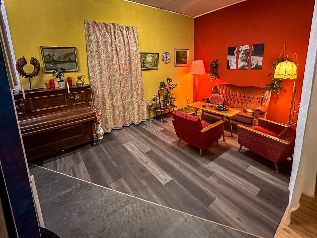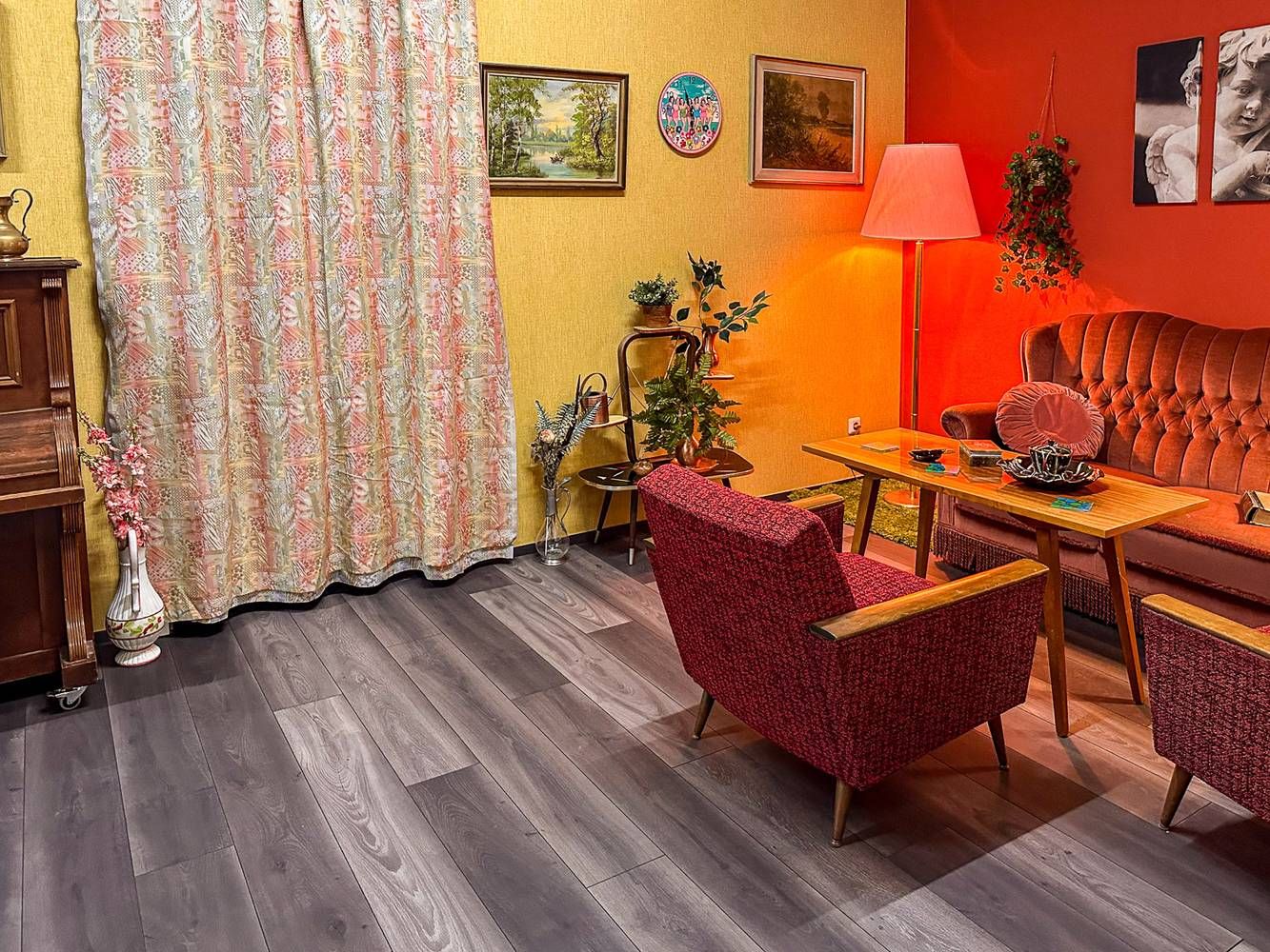 Das Set bietet Dir auf einer Bodenfläche von etwa 4 x 3 Metern ein Wohnzimmer im Look der 60er mit ganz viel passender Dekoration.