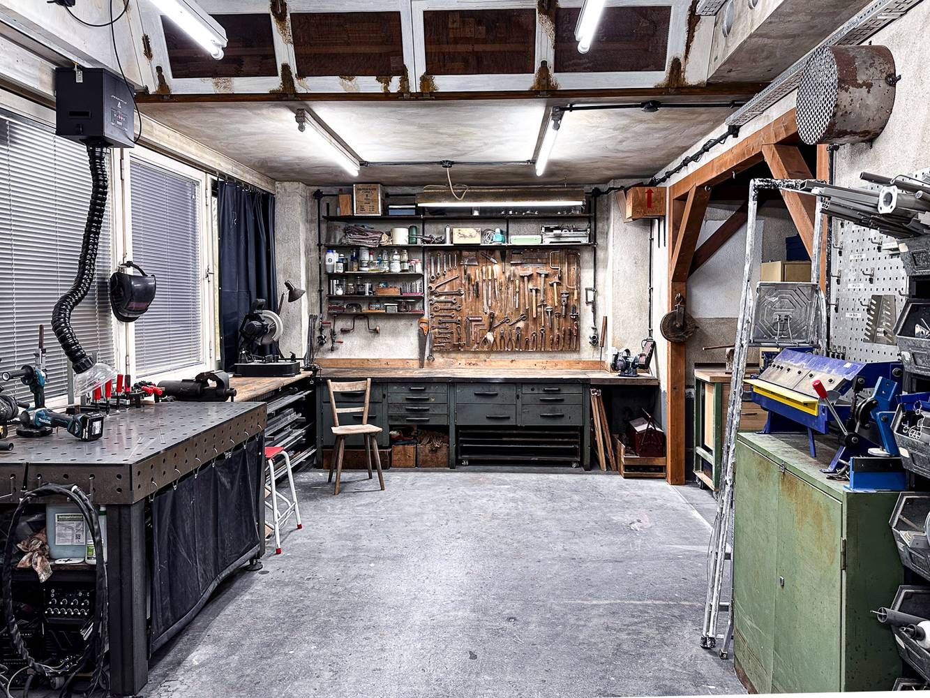 Studio 7 ist tatsächlich eine echte Werkstatt: Hier wird gefräst, geschweißt, gesägt, geschliffen, geborht und viel gehämmert. Daher ist das "Studio" natürlich auch mal mehr und mal weniger sauber und hat definitiv einen echten Used-Look. Auch alle Werkzeuge und Maschinen im Studio sind echt - eine tolle Dekoration, aber bitte mit Umsicht!